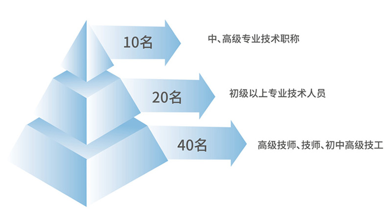 公司拥有70名技术人员和职业技术员工,其中:中、高级专业技术职称10名,初级以上专业技术人员20名,高级技师技师,初中高级技工40名。