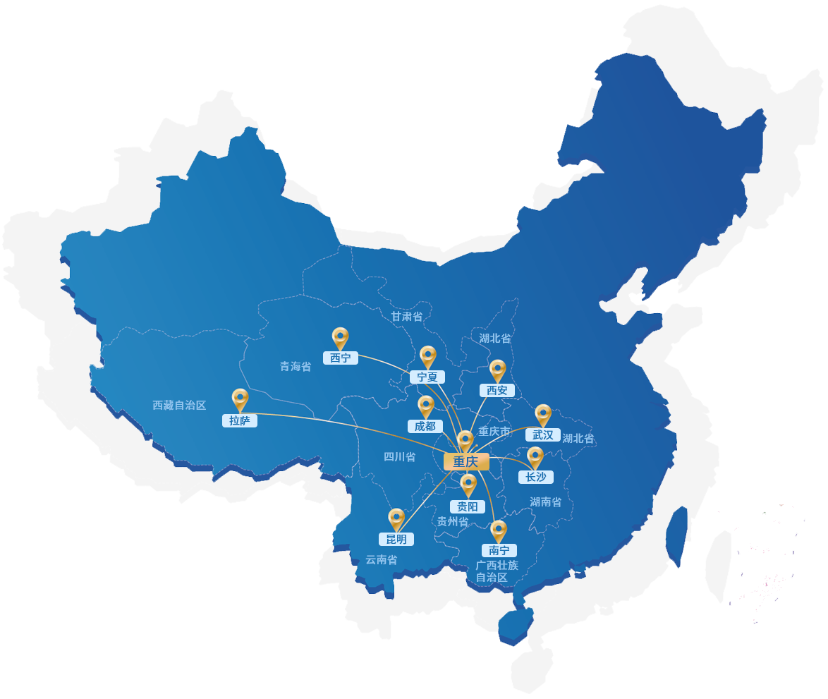 安钺钢厂扎根重庆市永川区,以此为核心,销售脚步主要遍及重庆、成都、昆明、贵阳西南四大中心城市,形成了“一核,四心”的初期销售路网。